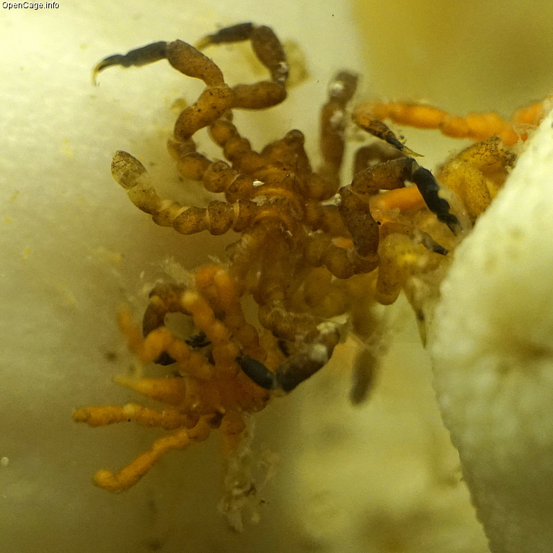 Después, la hembra recoge lo huevos ya fecundados gracias a su ovígeros y a continuación, el macho los cargará encima de él uno a uno. Cuando eclosionen las cías en forma de larva conocida como protoninfa, tendrá que pasar una serie de mudas o metamorfosis para parecerse a un adulto. Peri aun así son libre y presentan tres pares de patas.